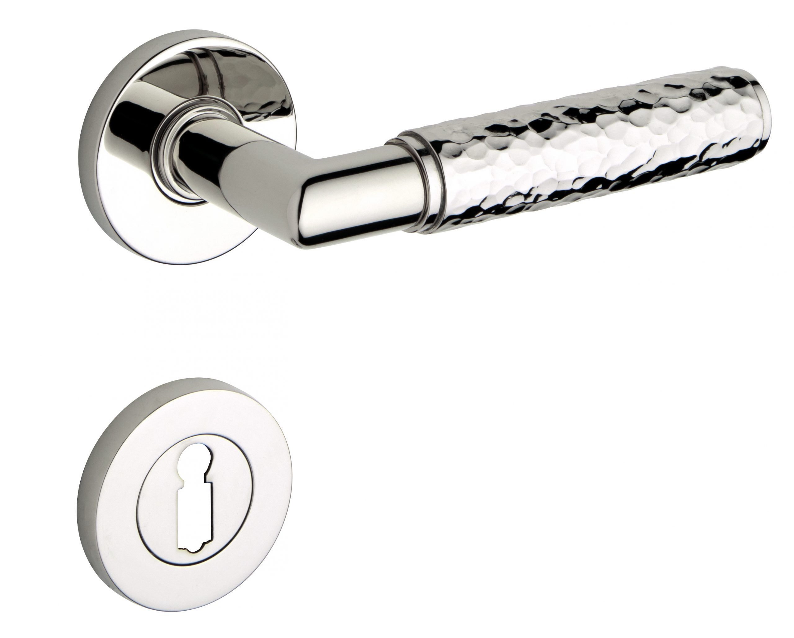 Bauhaus Drücker-Rosetten-Garnitur CLARK 07 mit einer einzigartig und individuell gehämmerten Handhabe. Drückerlänge: ca. 120 mm Handhabe aus Metall Ø ca. 20 mm Rosetten: Ø 50 x 9 mm inkl. Hochhaltefeder Folgende Schlüsselrosten können wir Ihnen Anbieten Buntbart BB (in Nickel poliert abgebildet) Profielzylinder PZ WC/Bad mit Notöffnungsschlitz Oder Ganz ohne Schlüsselrosette NSB Lieferumfang: eine komplette Garnitur, inklusive aller Befestigungsmaterialien sowie der Vierkant und Sechskantschlüssel für Türstärke 38-45 mm. Es handelt hierbei um Sonderanfertigungen die vom Umtausch und der Rücknahme ausgeschlossen sind. Der Drücker ist auch mit vielen anderen Rosetten und Langschildern kombinierbar. Anfragen bitte an: info@beschlaege-aus-hamburg.de