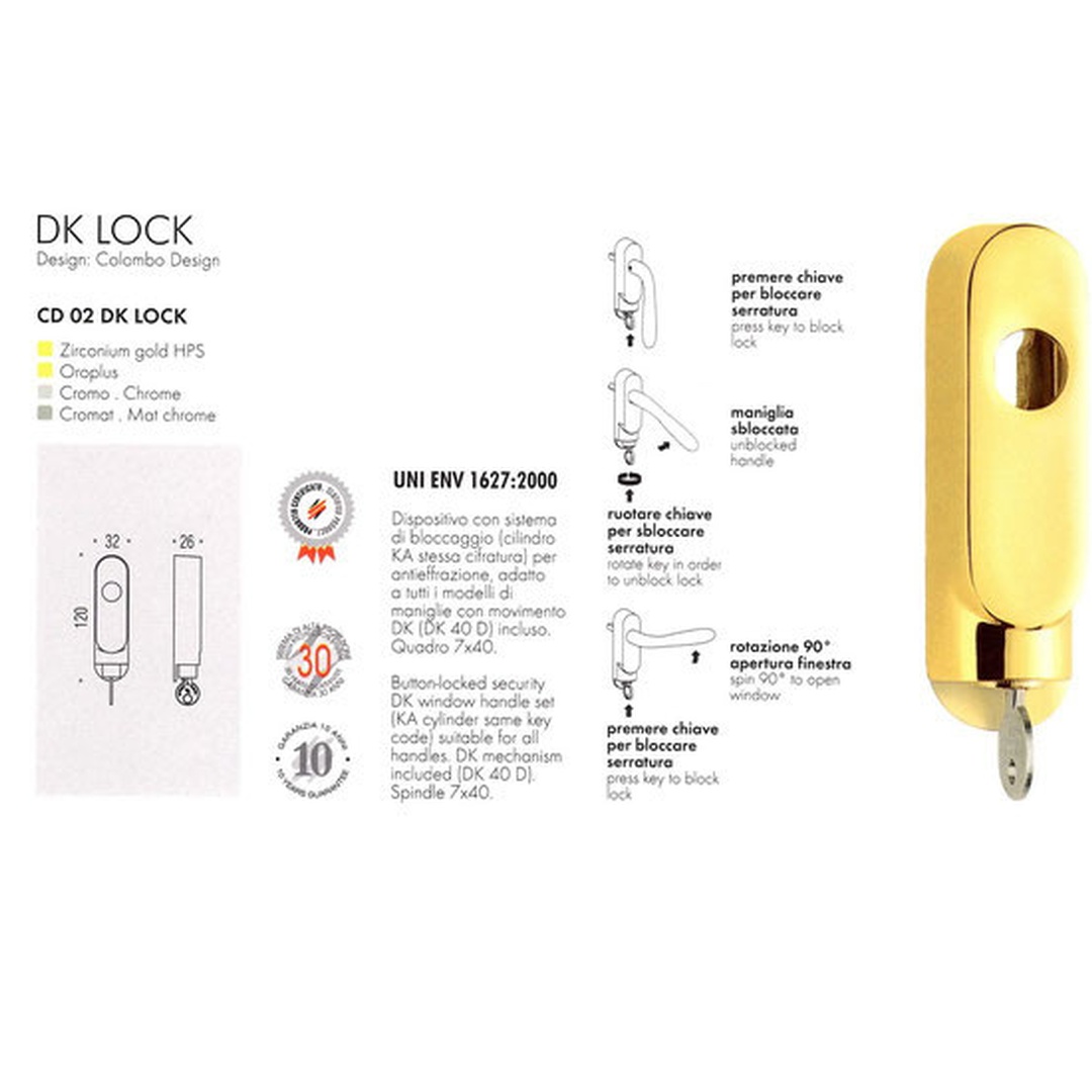 Dreh-Kipp Fenstergriff mit 90° Rasterung Design: COLOMBO DESIGN Stahl-Unterkonstruktion DK/D BA 43 mm; VK 7 x 7 x 35 mm (andere Längen des Vierkantes auf Wunsch) Madenschraube im geschlossenen Zustand links Lieferbare Oberflächen: Chrom poliert CR Matt verchromt CO Messing poliert lackiert LU Schwarz matt lackiert SM Weiß lackiert WE Optional auch mit abschließbarer Unterkonstruktion ABS erhältlich. bitte treffen Sie Ihre Auswahl im pulldownmenü