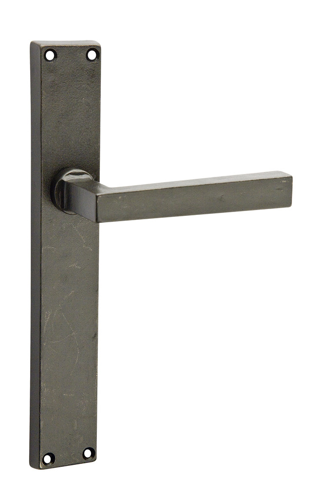 Drücker Langschild Garnitur aus Bronze in verschiedenen Patinas und Varianten. Die moderne Form und das archaische Bronzematerial in den klassischen Patinas oder auch einfach in schwarz ergeben eine einzigartige Kombination. Der Griff ist ca. 120 mm lang und die Schilder sind 40 x 240 x 12 mm. Die Abstände sind bei Buntbart und PZ nach DIN 72 mm und bei der WC/Bad-Garnitur 78 mm nach DIN Andere Lochabstände für die Schweiz, Österreich usw. fragen Sie bitte an. Das Photo zeigt die Garnitur in Bronze schwarz patiniert BLK ohne Schlüsselloch Bitte wählen Sie im pulldownmenu Ihre Patina und welche Schlüssellochung Sie wünschen.