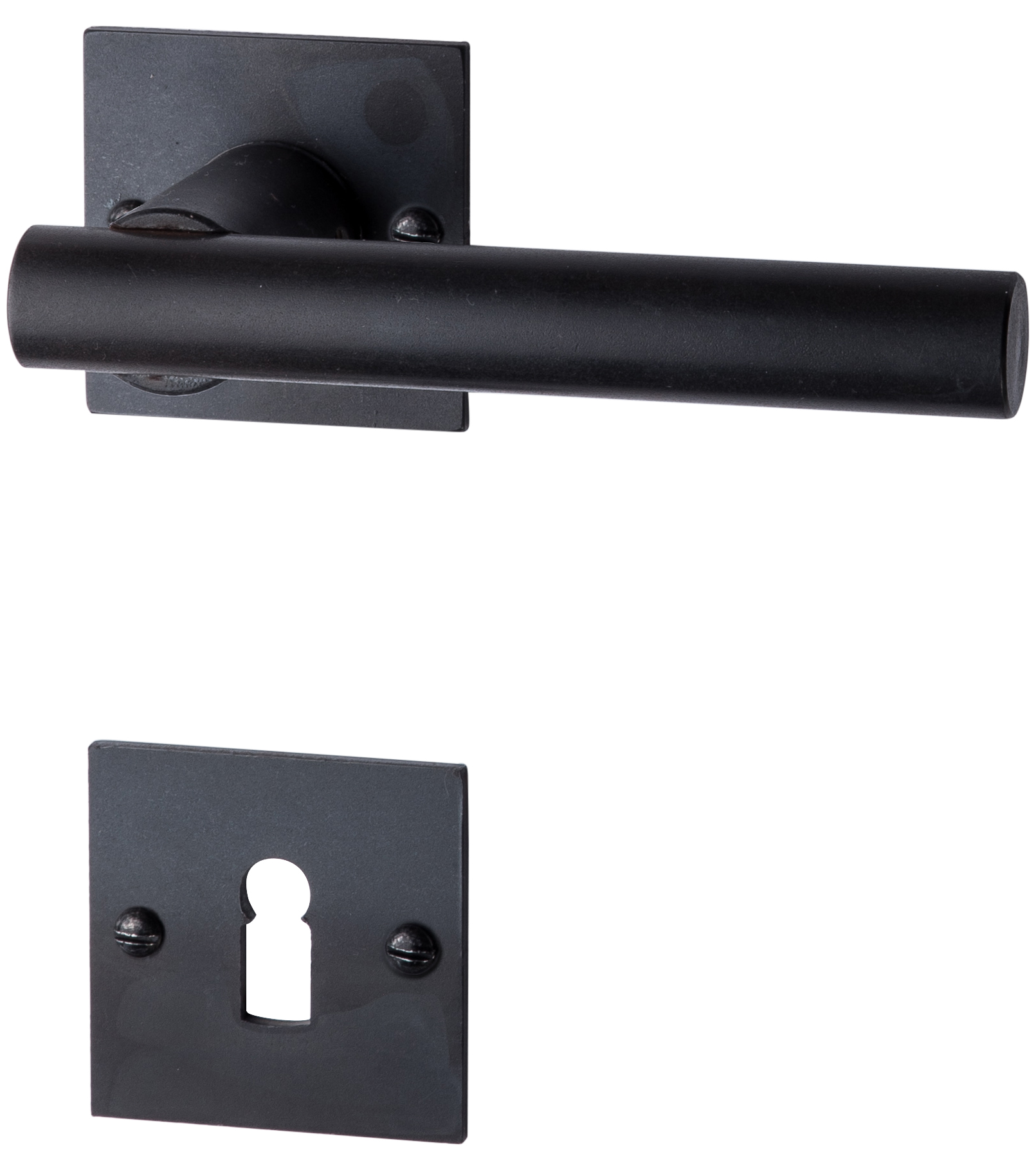 HALCÖ Drücker-Rosettengarnitur FÜGEN in schwarzSTAHL mit quadratischen Rosetten. Hier bieten wir Ihnen die Garnitur in der außergewöhnlichen Oberfläche: schwarzSTAHL Lieferumfang : 1 Paar 125 mm lange Drücker mit runder 18 mm Handhabe sowie einem Paar Drücker- und optional Schlüsselrosetten Bbt. oder PZ gelocht bzw. einem Paar WC-Bad Rosetten in der gewünschten Oberfläche. Rosetten : 52 x 52 x 3 mm Bitte wählen Sie im pulldownmenu Ihre gewünschte Schlüssel- oder WC/Bad Rosette Die gewünschte Anzahl Ihrer Garnituren können Sie oben rechts im Warenkorb einstellen. Da sichtbar verschraubt bekommen Sie Linsen-Senkkopf-Holzschrauben mit Schlitz geliefert, ebenso den Vierkant 8 x 8 mm für 38 bis 45 mm starke Türen und einen Sechskantschlüssel.