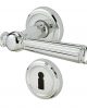 JATEC SANSSOUCI mit runden Bandrosetten R992 Rillen, facettierte Oberflächen und Kugeln die wie Perlen scheinen. Die royale Faszination und die perfekte Verarbeitung dieser Garnitur machen den Sanssouci zu einem klassischen Griff mit authentischer Schönheit. Der Griff ist 123 mm lang, die runden Rosetten 54 x 10 mm. Wie bei allen JATEC Garnituren mit klassischer Durchgangsbefestigung bei 38 mm nach DIN. Komplett mit Befestigungsmaterial für Türstärken von 38 – 45 mm größere Türstärken bitte unter Bemerkungen angeben. Standardoberflächen: Chrom poliert MPC (Photo) UltraNickel poliert MPN/PVD UltraMessing poliert MP/PVD Auf Wunsch: UltraBronze, AntikNickel, Messing brüniert u.a. Als FH Garnitur nach DIN18273 in sehr ähnlicher Ausführung in Edelstahl matt, poliert oder UltraMessing. (hier TS 40-47mm)
