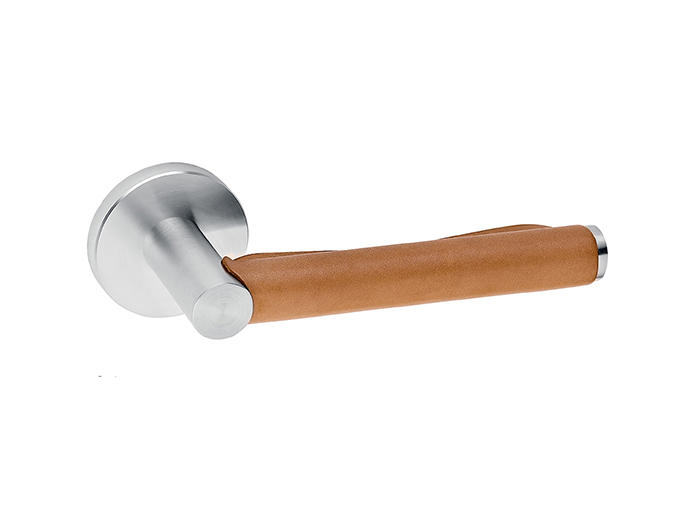 Drücker auf runden Drückerrosetten RB08M 50 x 8 mm mit integrierter Hochhaltefeder. Rosetten und Drückerhals bestehen aus Edelstahl mattem Material, die Handhaben variieren. Sie haben die Auswahl zwischen Handhaben mit Leder ummantelt in 3 Farben. Bitte wählen Sie ihre gewünschte Farbkombination im pulldownmenu, hier können Sie auch die Bbt.-Buntbartrosetten bzw. Profilzylinder PZ-Rosetten oder WC/Bad Rosetten hinzufügen.