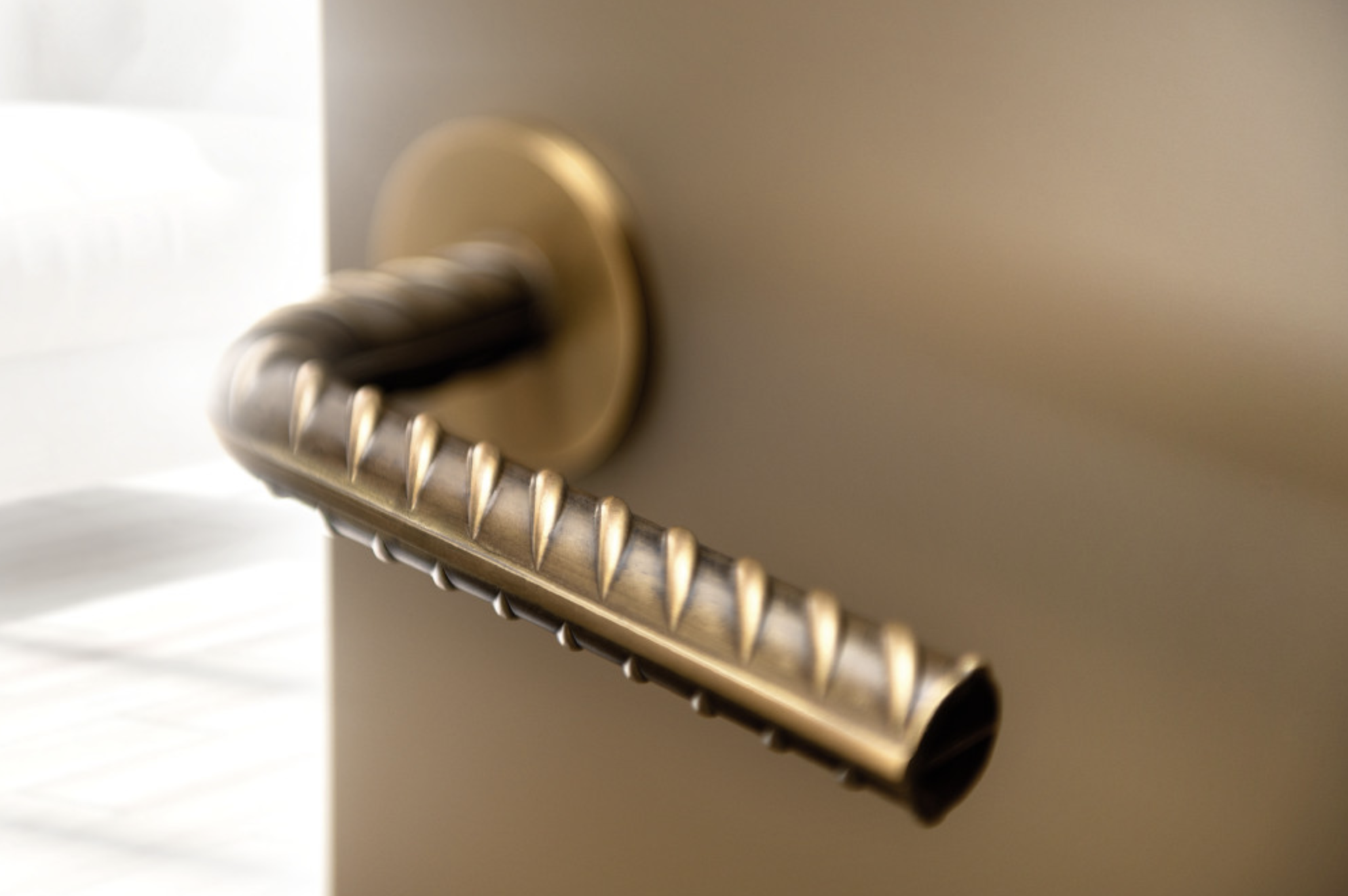archaische – eine an Armierungseisen erinnernde – Form in verschiedenen Oberflächen. Sie haben die Wahl zwischen der Garnitur – 1.) nur Drücker- und Drückerrosetten NSB oder 2.) mit Buntbart BB Schlüsselrosetten für normale Zimmertürschlösser BB, 3.) die WC/ Variante (wenn Sie ein WC/Bad Schloß haben oder planen) oder auch 4.) die Profilzylinder PZ Variante wenn Sie einen Profilzylinder planen oder haben. Bitte geben Sie unter Bemerkungen die gewüschte Farbe an. Ms-K Messing natur / unpoliert / roh entgratet Ms-L Messing poliert Ms-A Messing antik TiN-C Titan matt verchromt ähnlich Edelstahl matt TiN-K schwarz matt