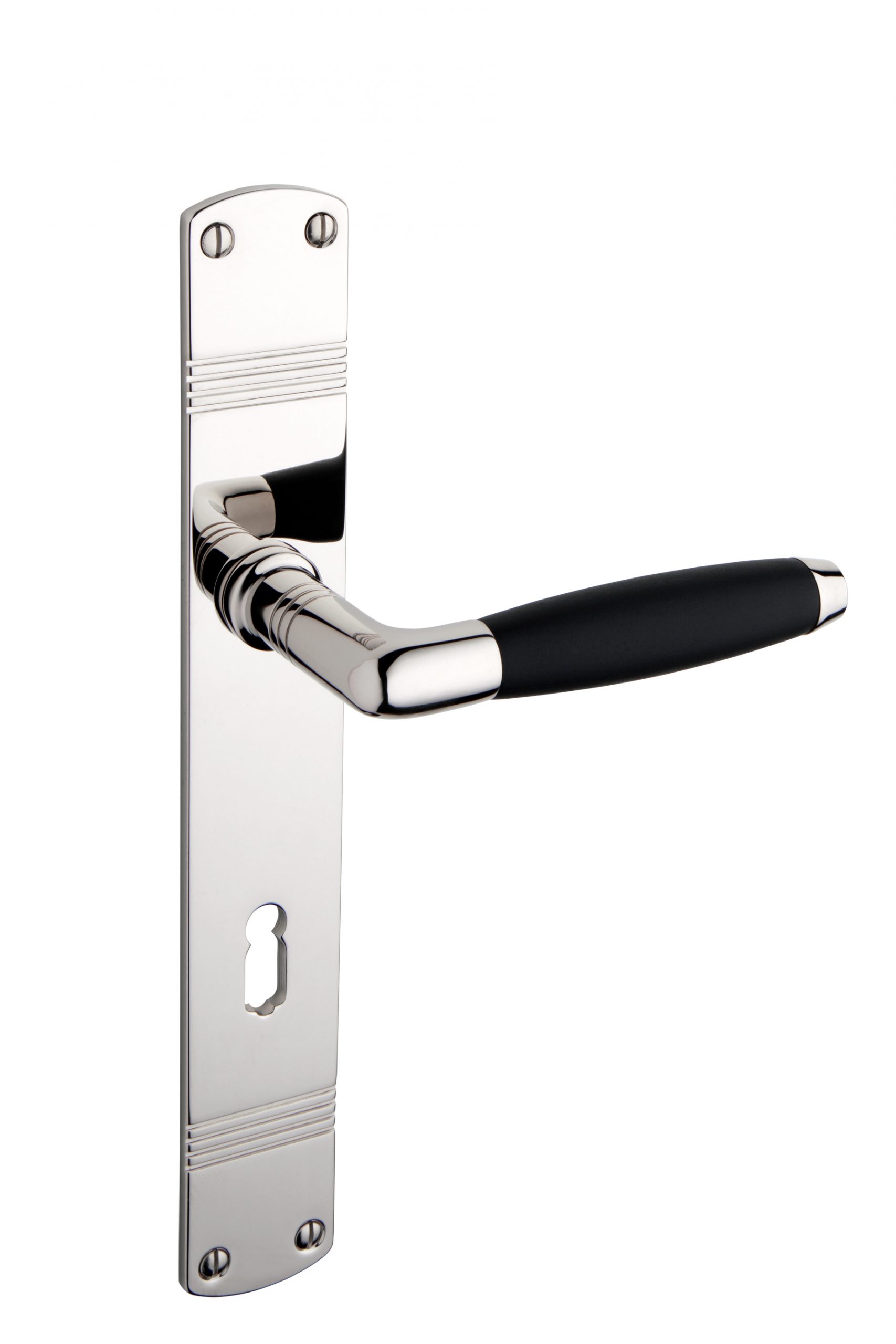Der Art dèco Klassiker – Schilder mit Riefen Drücker Modell TON/E mit Ebenholzhandhabe. Dieser Drücker besticht durch ebenfalls Riefen am Drückerhals. Der Drücker ist sehr angenehm zu greifen und mit der schwarzen Ebenholzhandhabe immer angenehm temperiert. Die beiden Langschilder 34 x 240 mm Der Abstand ist Standard 72 mm bei Buntbart und PZ und 78 mm bei WC/Bad Dieser Klassiker liefern wir in zwei gängigen Oberflächen. Wenn Sie andere Oberflächen oder Lochungen wünschen…. z.B. mit Abständen für Italien, die Schweiz oder Frankreich usw. lassen Sie uns das bitte wissen, wir machen Ihnen asap ein Angebot für diese Ausführungen. Die Photos zeigen den Klassiker in Nickel poliert mit Ebenholzhandhabe Im Lieferumfang sind alle Schrauben – natürlich Linsensenkkopf-Holzschlitzschrauben und KEINE Spax mit Kreuzschlitz….. enthalten.
