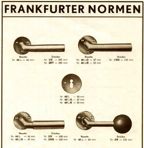 BAUHAUS Drücker-Rosetten-Garnitur im Design nach Architekt Ferdinand Kramer (1898 – 1985) entworfen um das Jahr 1925 im Zuge seiner „Frankfurter Normendrücker“. Die Klinke wurde später von vielen Herstellern ins Programm aufgenommen und gehört sicher zu den Ikonen des Industriedesigns in seiner schlichten konischen Form und der sehr schönen Handhabung. Das Photo zeigt die Nickel polierte Variante mit runden – unsichtbar verschraubten zweiteiligen – Rosetten. Bitte wählen Sie im pulldownmenu Ihre gewünschte Kombination aus Oberfläche und Schlüssellochung bzw. WC/Bad-Rosette. Die gewünschte Anzahl Ihrer Beschläge können Sie im Warenkorb einstellen. Lieferumfang : 1 Paar Drücker, 1 Paar Drückerrosetten 50 x 9 mm mit integrierter Hochhaltefeder – NSB ohne Schlüsselrosetten, mit Schlüsselrosetten Buntbart BB, Profilzylinder PZ oder mit WC-Badrosetten. Komplett mit Befestigungsmaterial.