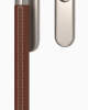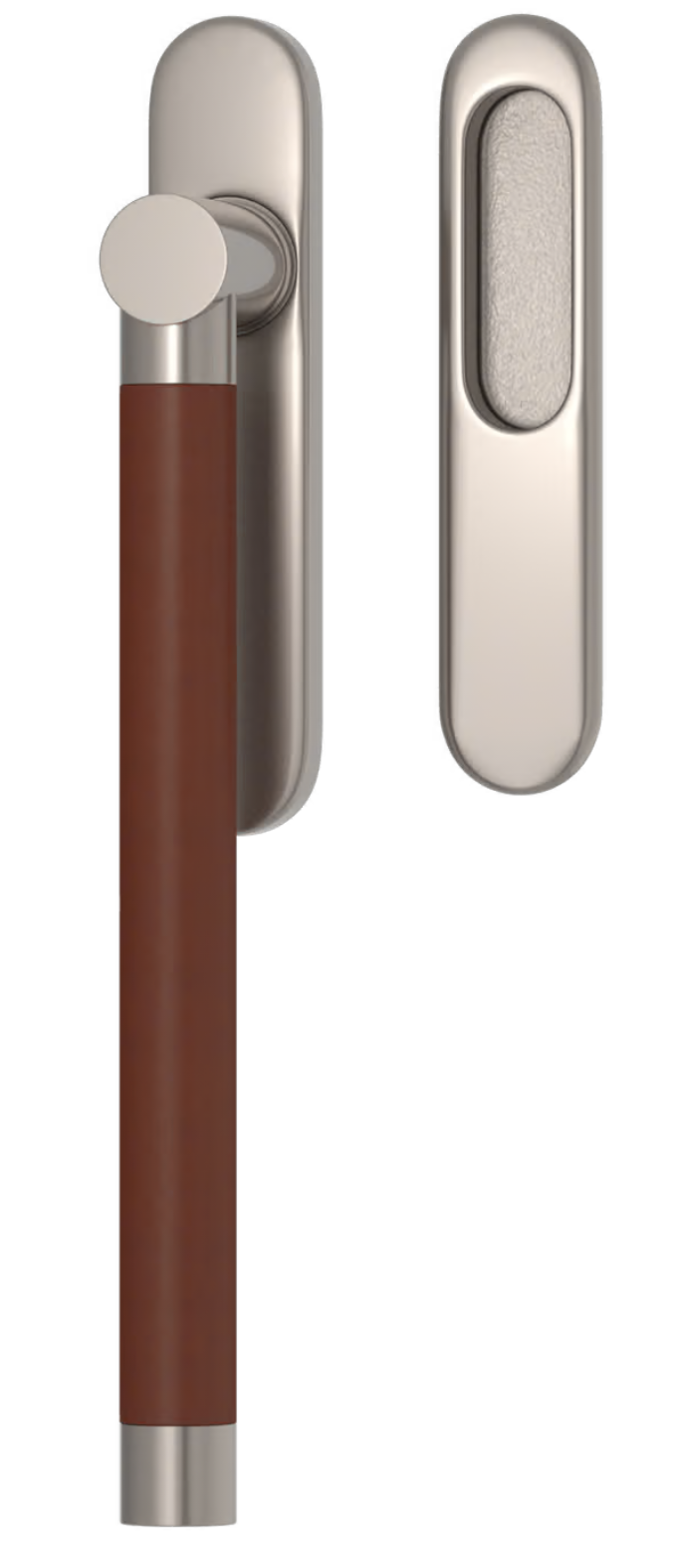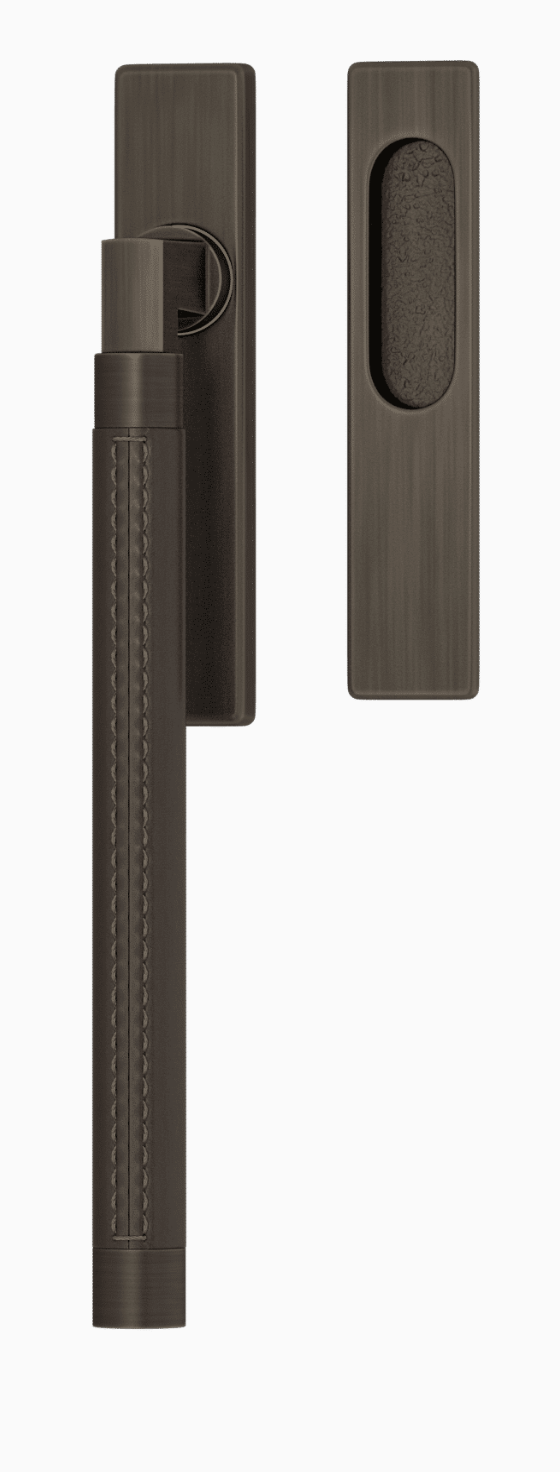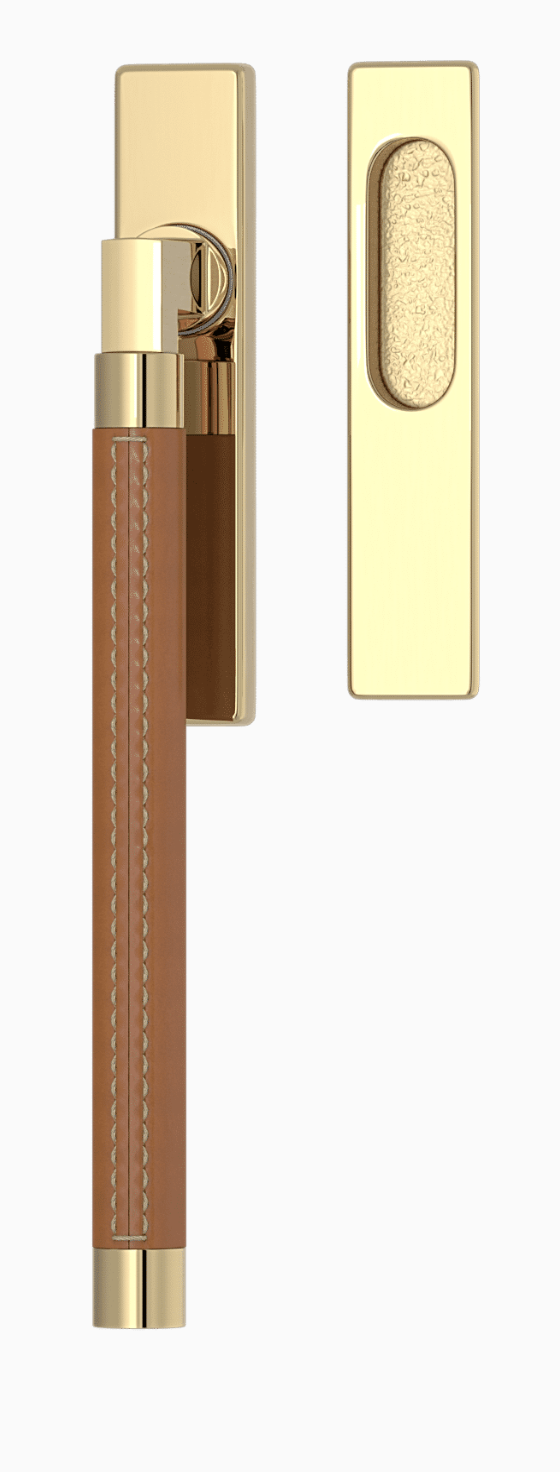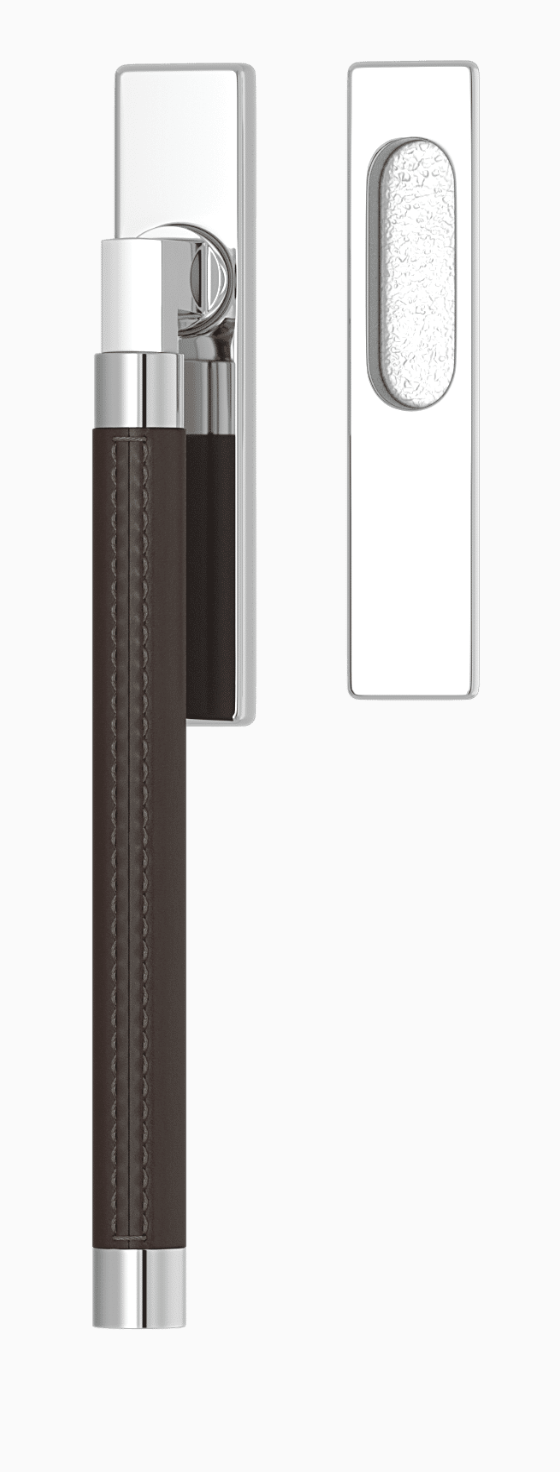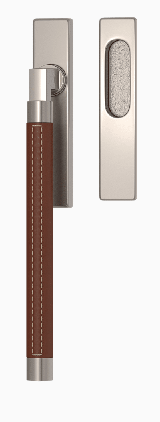 Bauhaus Hebe-Schiebetür-Griff im Design nach Walter Gropius und Adolf Meyer mit Rasterung und unsichtbarer Verschraubung. Material: Messing und Leder Hersteller: Turnstyle ACHTUNG: Sonderanfertigungen – Umtausch oder Rücknahme sind nicht möglich !!! Oberflächen: Nickel poliert MPN, matt vernickelt MMN(siehe Photo), Chrom poliert MPC oder Messing poliert unlackiert MPu Lederfarben: Kastanie / chestnut CN, dunkelbraun / chocolate CT, schwarz /black BL, hellbraun / Tan TA Das Photo zeigt die Kombi: Matt vernickelt MMN und kastanienfarbenes Leder CN chestnut mit sichtbarer Naht Sie können die Naht außen sichtbar oder auf der Rückseite unsichtbar bekommen. Länge des Hebels: 240 mm Anschraubplatte: ca. 33 x 160 mm mit oder Profilzylinder PZ Lochung Schraublochabstand: 80 mm nach DIN Vierkant: 10 mm Lieferumfang: 1 Hebe-Schiebetür Griff mit Griffmuschel ca. 33 x 160 mm und Befestigungsmaterial, Bitte geben Sie unter Bemerkungen die Wahl der Farbe, des Leders und ob die Naht sichtbar sein soll oder nicht. Dazu bitte dann noch die Info ob Sie eine Profilzylinder PZ Lochung auf der Innenseite haben möchtenm oder nicht ACHTUNG: Sonderanfertigungen – Umtausch oder Rücknahme sind nicht möglich !!! PREISE AUF ANFRAGE
